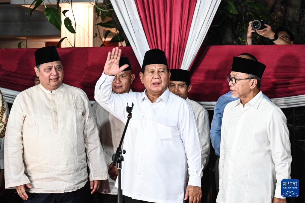 3月20日,在印度尼西亚雅加达,普拉博沃(中)出席媒体记者和支持者到场的集会。新华社发(阿贡摄)