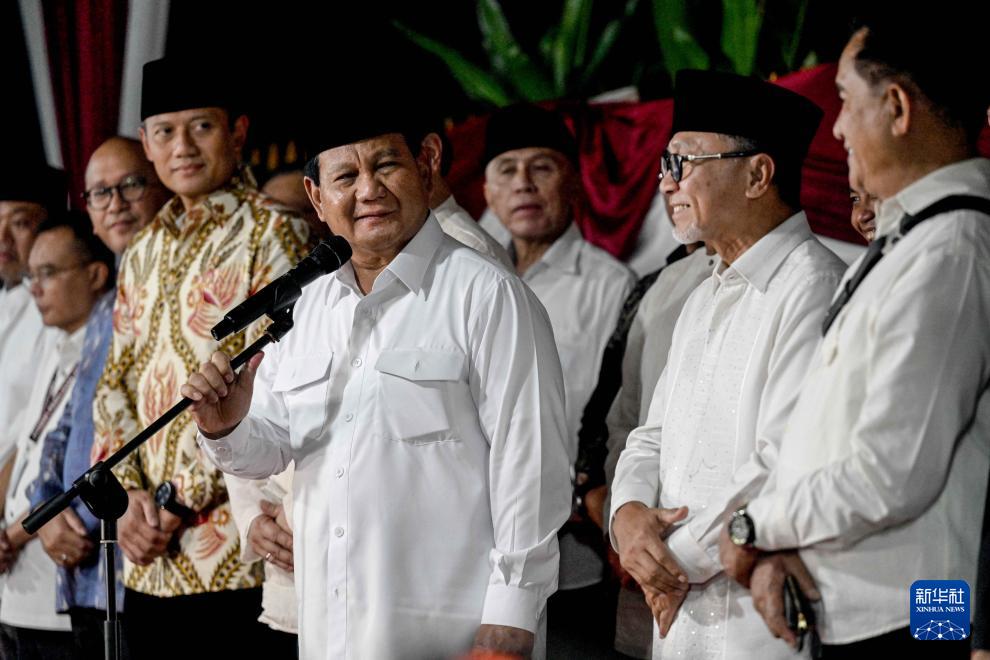 3月20日,在印度尼西亚雅加达,普拉博沃(中)在媒体记者和支持者到场的集会上讲话。新华社发(阿贡摄)